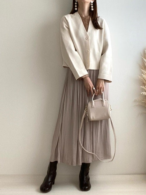 ショート丈のVネックカーディガンは、ボリューム感のあるフレアスカートやワンピースと好相性です。