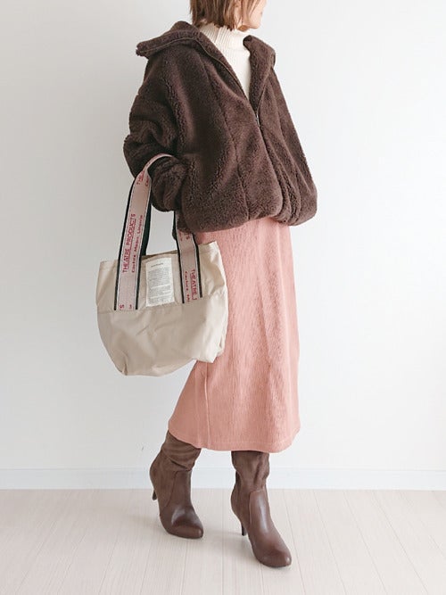 アウターとブーツを同じ色味で揃えると統一感がでますよ。