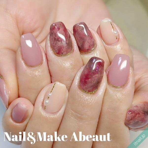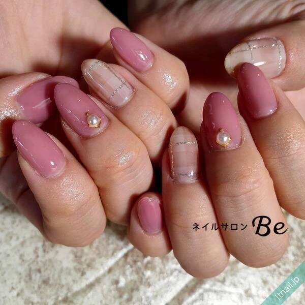 くすみピンクとグレージュを合わせたシンプルなネイルデザイン。存在感のある一粒パールを添えると、まるでアクセサリーを付けたように上品に仕上がります。根元に配置したバランスもGOOD。