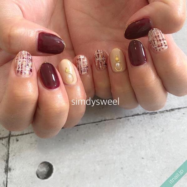 柄デザインのネイルは、ともすれば張り切ってオシャレした感が漂いがち。そこでパールのデコレーションがおすすめなんです。大人っぽさがグッと高まりますし、全体の雰囲気も引き締まりやすいですよ。