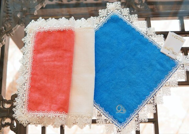 一枚仕立ての総レースのショールから旅行に持っていきたいバックやポーチといったカジュアルな小物までオシャレな日常品が数多く揃うなかで人気なのが、レースのタオルハンカチです。高級ベルベットのような今治産のタオル生地に縫い付けられるオリジナルレースは、洗濯してもシワにならずノーアイロンで手入れしやすいポリエステル素材。使い勝手がいいうえに品の良さも演出してくれるお店の看板商品です。