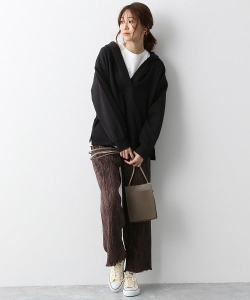 プリーツパンツ×スリットネックパーカー