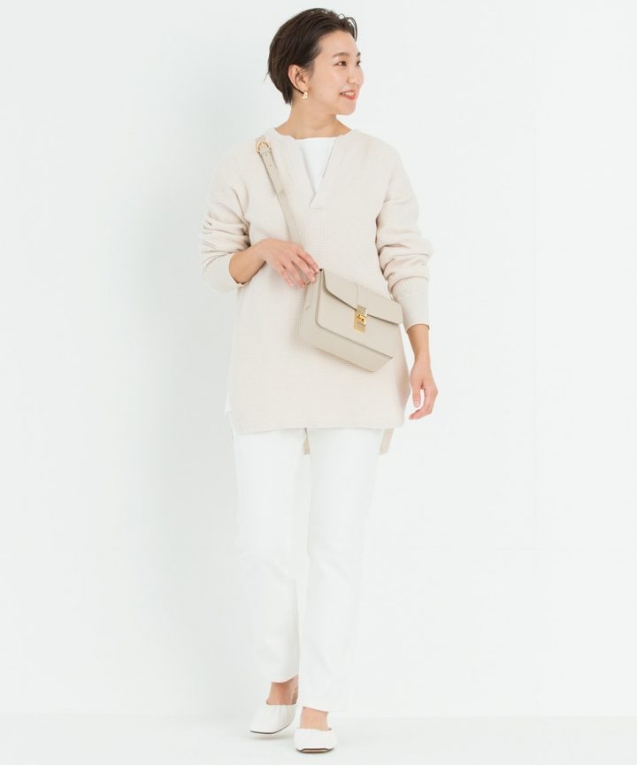 ニットを肩掛けするひと手間を加えれば、旬なムードがぐっと高まります。