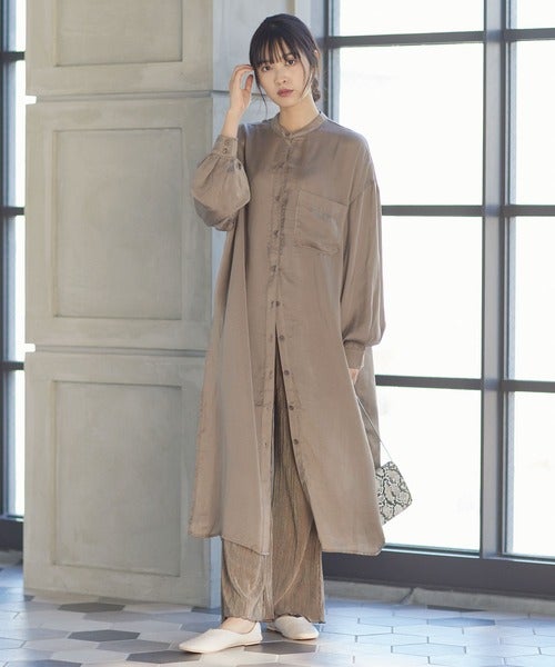 シャツワンピースにプリーツパンツをレイヤードして、今年らしくスタイリング。