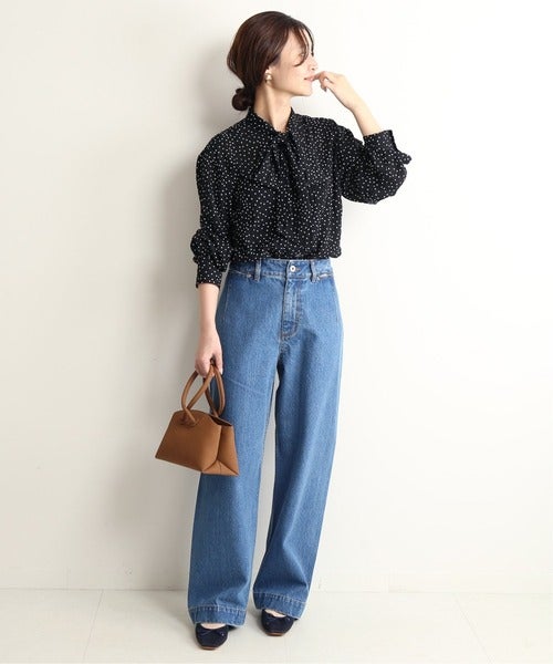 ラフなデニムパンツは、フェミニンなブラウスやパンプスでテイストMIXコーデに。