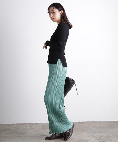 プリーツパンツのシャイニーな素材感も、大人っぽさをぐっと格上げしてくれています。