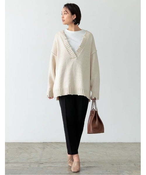 テーパードパンツ×Vネックニット