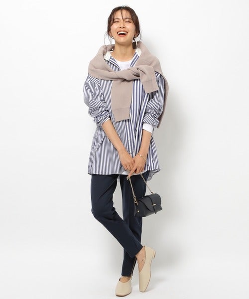 テーパードパンツにゆったりシャツを合わせて軽やかな着こなしに。