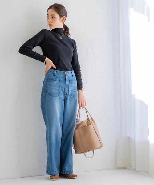 デニムパンツ×タートルネックプルオーバー
