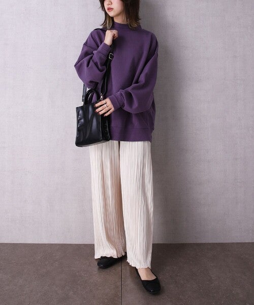 一見コーデ作りに悩んでしまいそうなパープルのハイネックスウェットも、ライトカラーのボトムを合わせるだけでおしゃれな大人の着こなしが作れます。