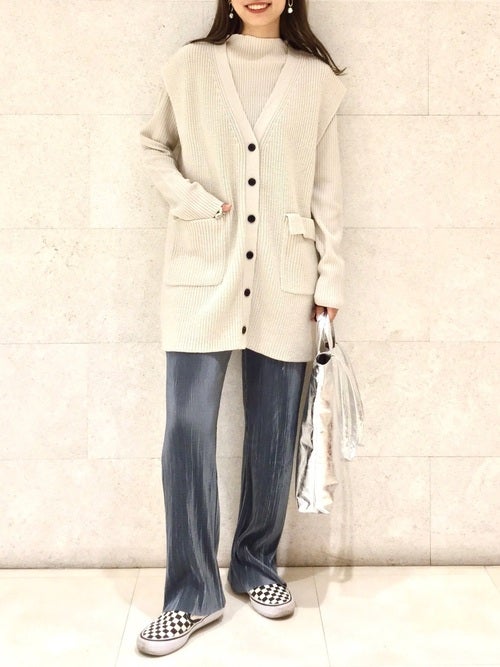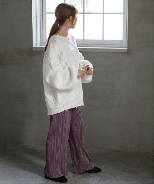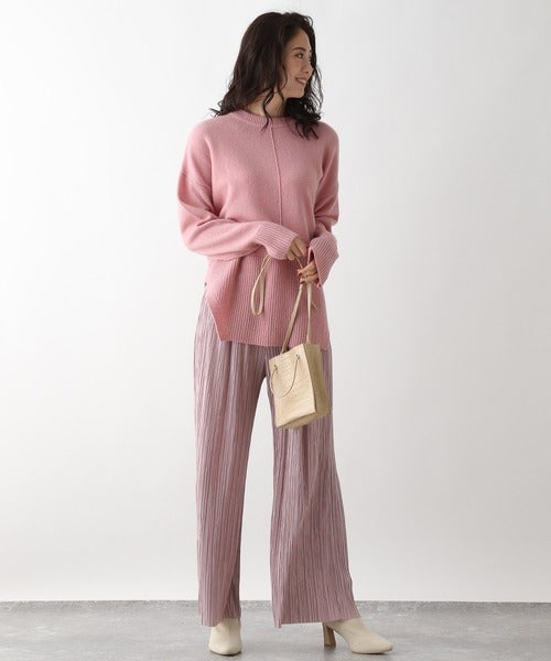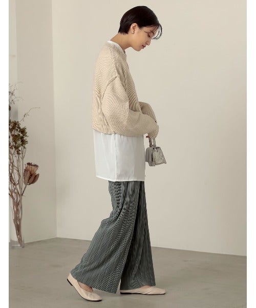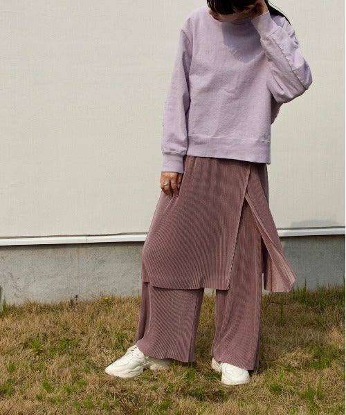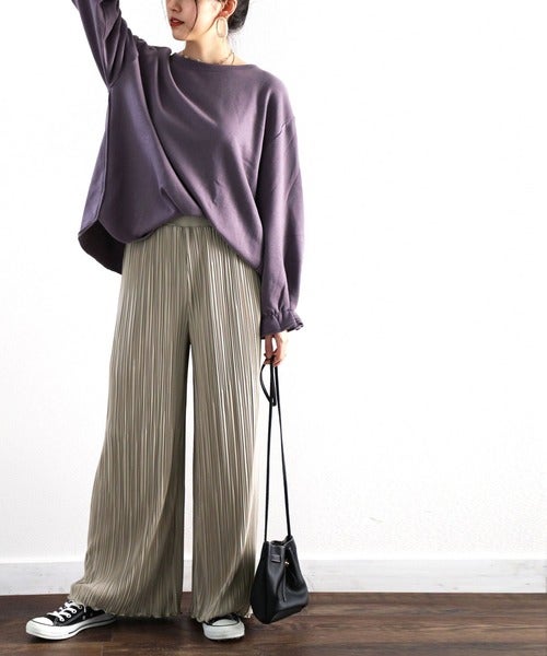 グレイッシュベージュのプリーツとメローが可愛いボトムは色合わせに困りにくく、パープル系とも好相性。
