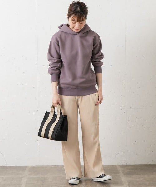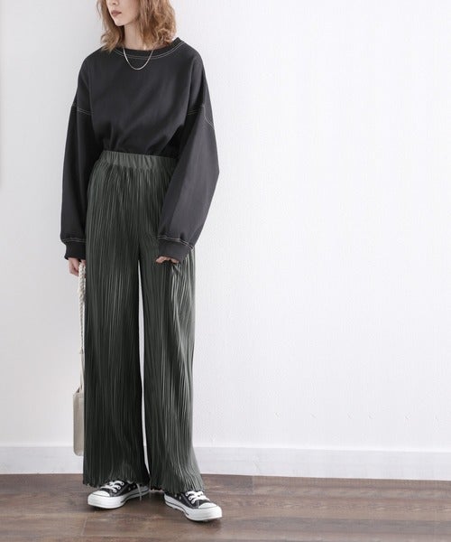 メンズライクなスウェットも、プリーツデザインのパンツをプラスするだけでレディースを感じる着こなしが作れます。