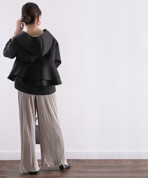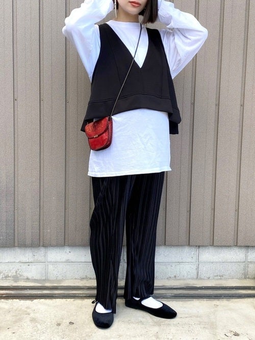 プリーツが加わったデザインなら、黒のパンツスタイルでもレディースらしさが演出できます。