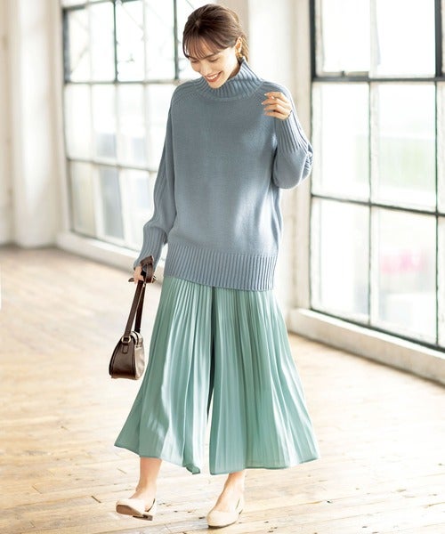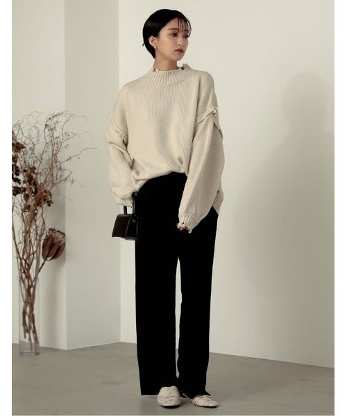 ゆったりとしたニットは、ワイドなボトムスと合わせるとトレンドのオーバーシルエットコーデが簡単に完成します。