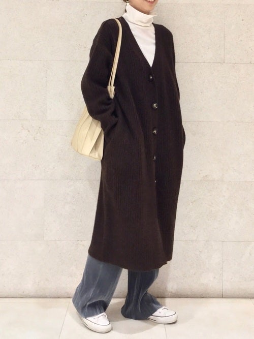 靴はトップスと同じ白系、バッグはロングカーディガンと同じブラウン系をセレクトし、統一感を意識しましょう。