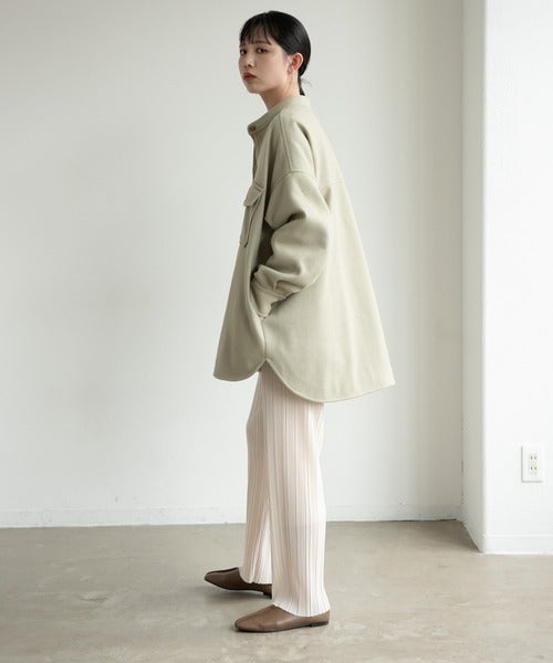 メンズライクな洋服ですが、プリーツデザインを加えるだけで女性らしさが香ります。