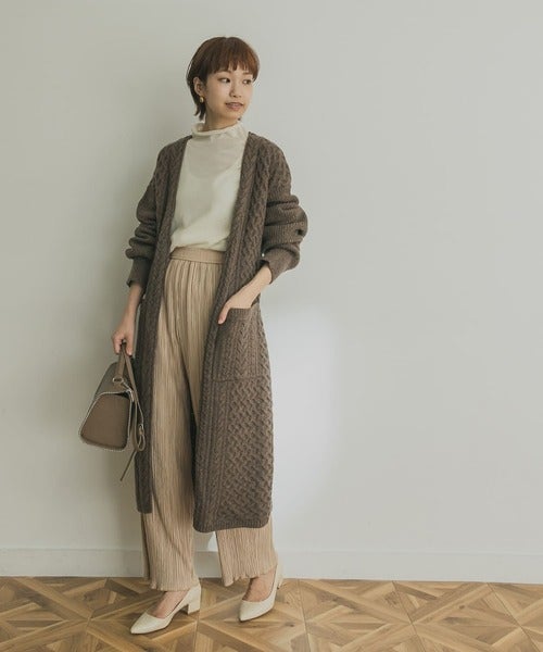 ベージュのボトムスは、白系トップスと茶色カーディガンによくなじみます。