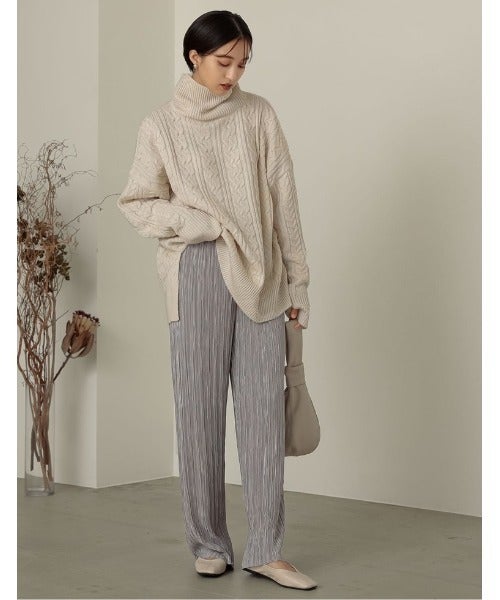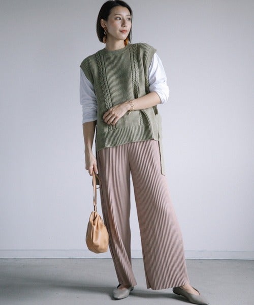 パンツスタイルでも女性らしさが香る流行りのプリーツパンツ。
