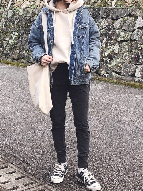ビッグシルエットのデニムジャケットなら、厚手のパーカーでも着ぶくれしません。