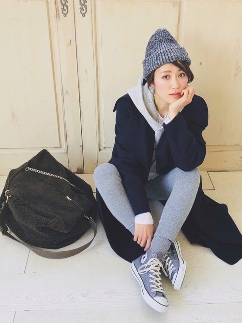 ここではオールグレーコーデにネイビーのトレンチコートをセレクトし、きれいめなミックスコーデにまとめています。