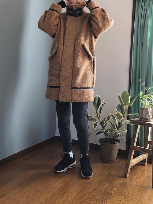 アウターは黒、スニーカーはブラウンを選んで、ベーシックカラーで統一したスタイリングです。