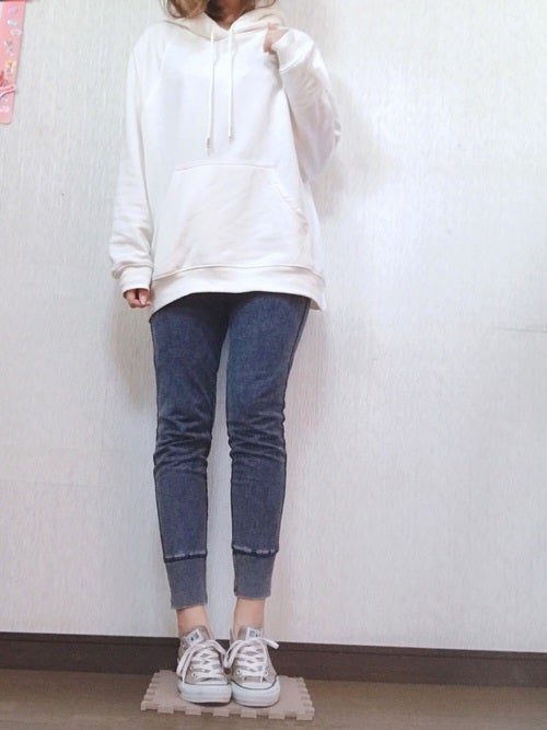 H&Mの真っ白いパーカーとGUスウェットパンツを合わせた冬コーデです。