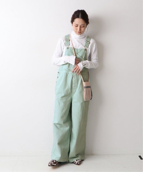 パッと目を引くミントグリーンカラーのオーバーオール。