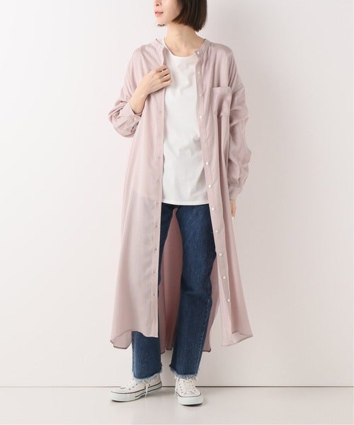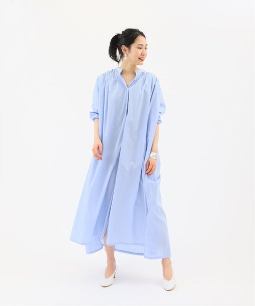 テロっとした生地感が表情豊かな着こなしを叶えてくれるノーカラーシャツワンピース。