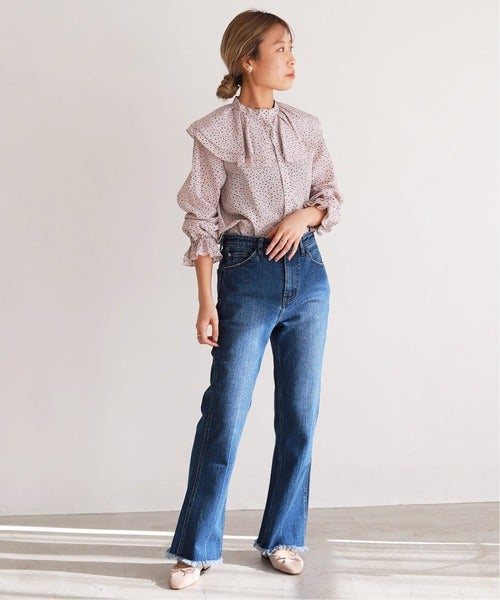 着こなしに華やかさをプラスしてくれるラッフルカラーデザインが、大人の可愛げムードを引き寄せます。デニムパンツとの相性もぴったり。