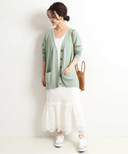 ヒップが隠れる着丈のベーシックなニットカーディガン。爽やかなグリーンカラーが明るい印象をプラスしてくれます。