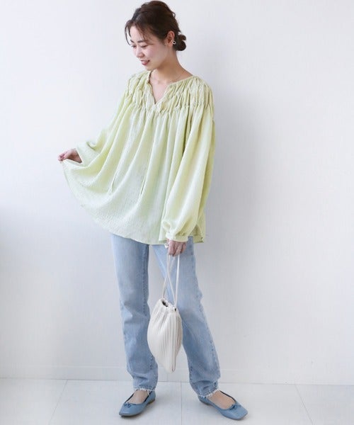 ギャザーをたっぷりと寄せた、ふんわりシルエットが大人フェミニンな着こなしを叶えてくれるシャーリングブラウス。