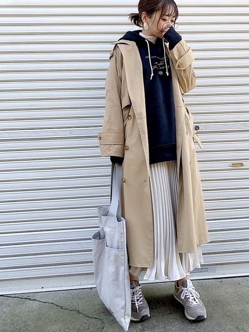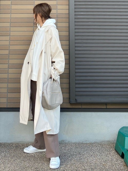 カジュアルなパーカー&きれいめなロングトレンチアウターのオーバーサイズなアイテム同士の着こなしは、ラフになり過ぎないようカラーに統一感を持たせて、見た目にもすっきりと仕上げるのが2021年流の大人のおしゃれルールなんです。