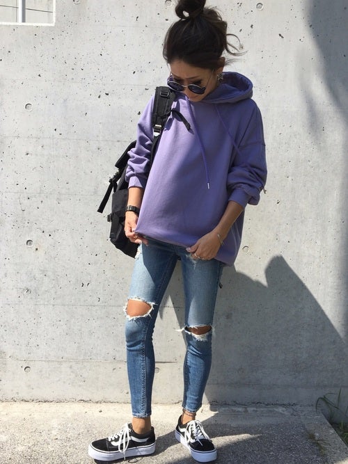 紫オーバーサイズパーカー×ダメージデニム