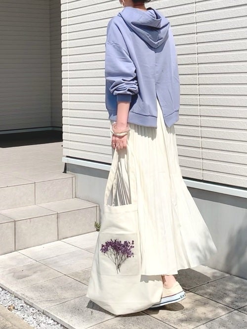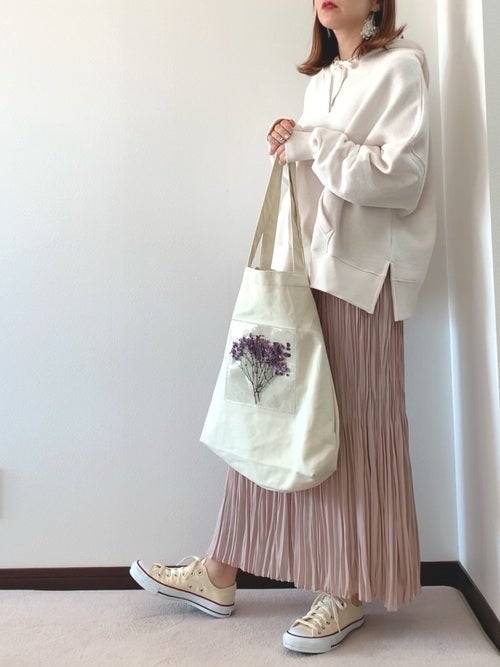 春らしい白のレディースのオーバーサイズパーカーならではの存在感を堪能するなら、ボトムスはスモーキーなピンクが大人可愛いプリーツスカートで着こなしに柔らかくなじませるのが正解。