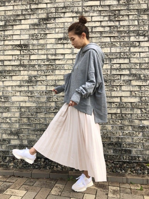ダボダボとしたゆとりが大人可愛いレディースのグレーパーカーと、春らしくエアリーな白プリーツスカートの旬のバランスがおしゃれな着こなし。