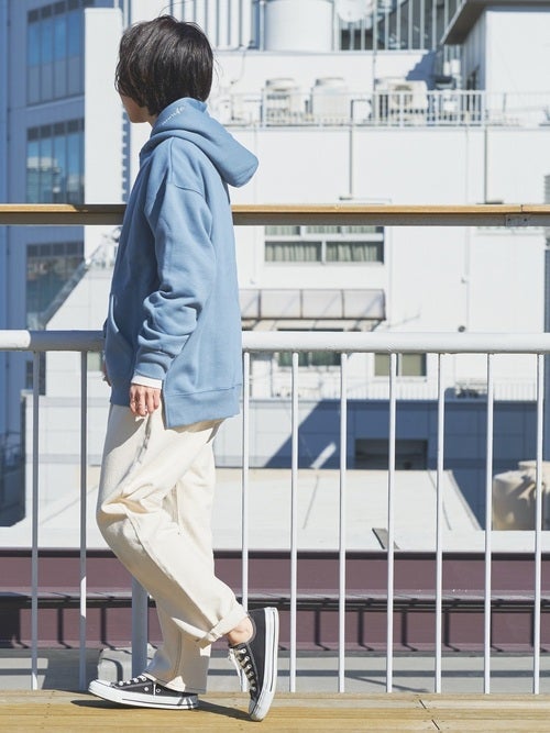 春の澄み渡る青空をイメージさせるライトブルーのオーバーサイズパーカーは、よく晴れた日にぜひコーディネートに取り入れたい一着。