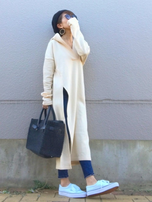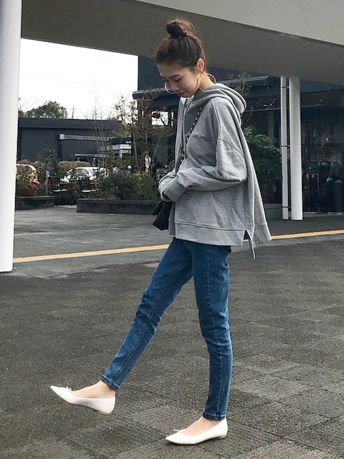 とはいえ知り合いにバッタリ会っても慌てないよう、白のスリット入りオーバーサイズパーカー+スキニーデニムのやり過ぎないおしゃれが理想なんです。