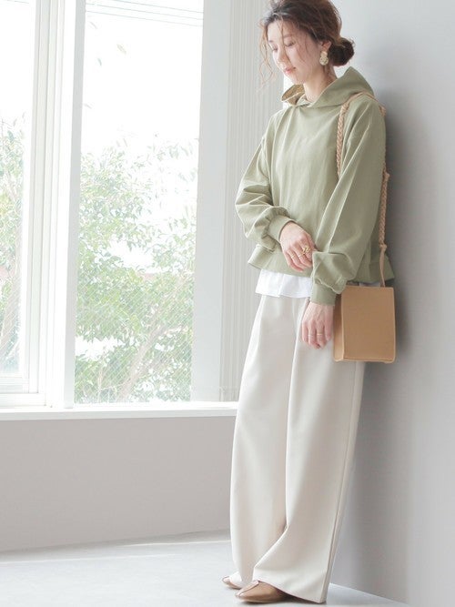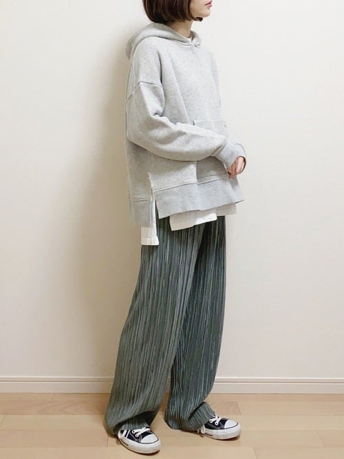 オーバーサイズなグレーのパーカーは、くすみグリーンのプリーツパンツ合わせでリラクシーな中にも2021年春ならではの繊細なムードの漂う春コーディネートにまとめてみてはいかがでしょうか。