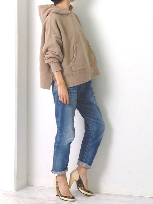 中でもベージュのオーバーサイズパーカープラスになるようテーパードデニムにチェック柄のヒールパンプスを組み合わせたコーディネートなら、きれいめ感とカジュアルさのバランスか大人女性にジャストですよ。