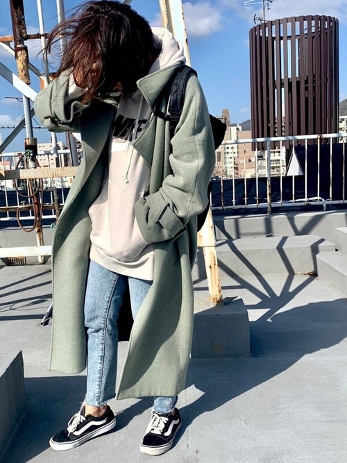 例えば人気のロゴパーカーも、今春らしいオーバーサイズなデザインやまろやかなオフホワイトのアイテムをセレクトして、スモーキーなグリーンのロングコートと上手にバランスを取っていますね。