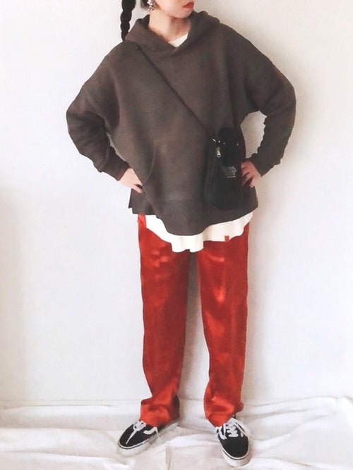 きれいめ派さんからも支持多数な赤のサテンパンツを主役に、ブラウンのオーバーサイズパーカーでスタイリッシュなムードたっぷりな2021年春流のレディースのカジュアルコーディネートにトライ。