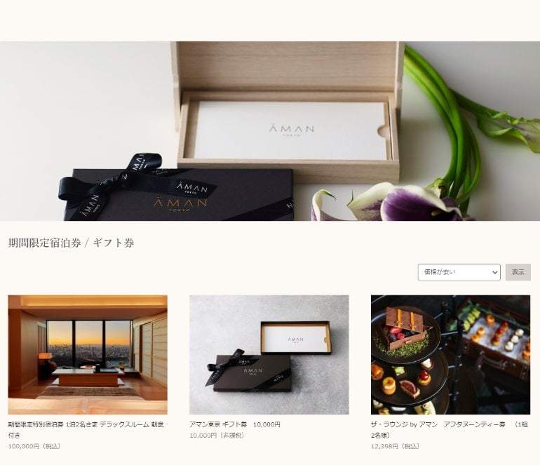 ギフト券は、「アマン東京」の宿泊券をはじめ、イタリアンレストラン「アルヴァ」と、鮨店「武蔵 by アマン」でのランチおよびディナー券、また、「ザ・ラウンジ by アマン」のアフタヌーンティー券、そしてホテル内でご利用可能な金券(10,000円・非課税)を販売。