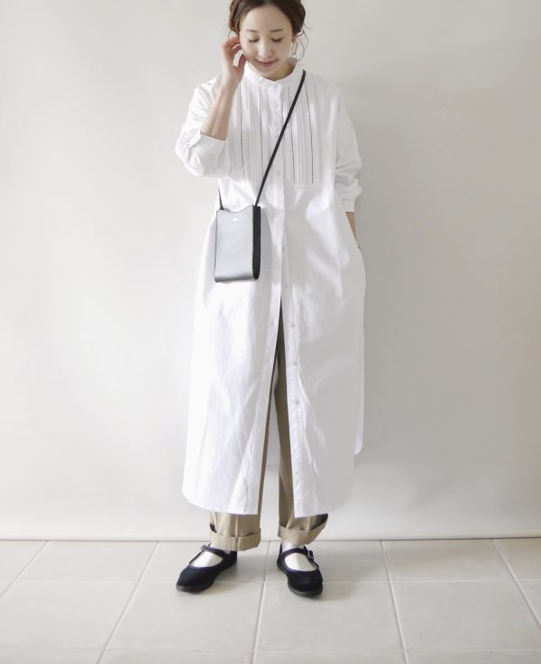 春に必須の白ワンピースは要チェックです。チノパンとフラットシューズでシンプルお洒落な着こなしに。