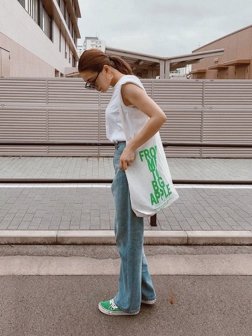シンプルな白タンクトップ+ブルーデニムの着こなしに組み合わせたら、グリーンのロゴ入りのキャンバストートバッグと色を上手にリンクさせましょう。