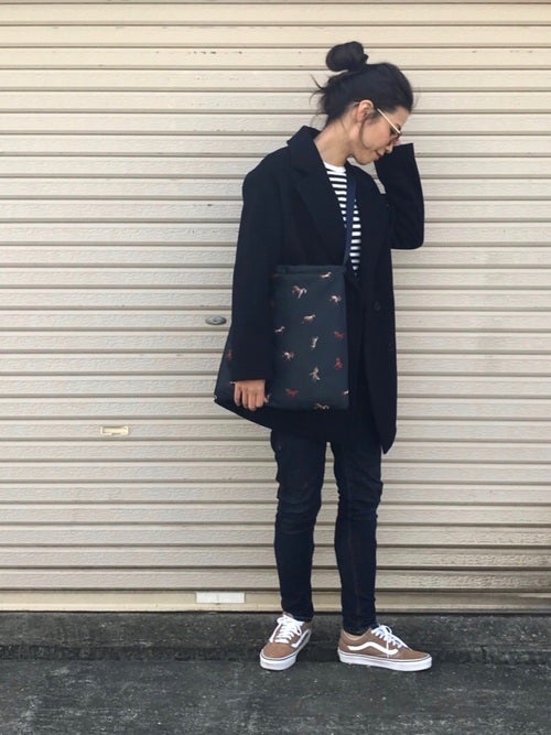さらにインナーのボーダートップスや柄ショルダーバッグで、さりげなくも個性をしっかりとアピールしているところもおしゃれ上級者さんならではですね。