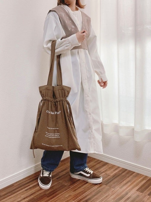 2021年春なら、トレンドでもある白ロングシャツワンピース+刺繍入りビスチェのカジュアルガーリーな着こなしの引き締め役として組み合わせてみても◎ですよ。