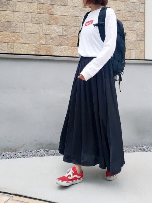 一見合わせにくい印象のある赤のVANSオールドスクールスニーカーも、白ロングTシャツ+黒フレアスカートのカジュアルガーリーなファッションの足元に組み合わせれば、難なくクリア可能ですよ。