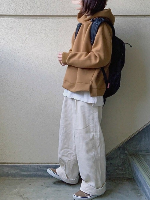 トレンドでもあるブラウンカラーのパーカー+白ワイドパンツのレディースコーディネートの足元に迷ったら、まず人気のブラウンのVANSオールドスクールスニーカーを手に取ってみて。