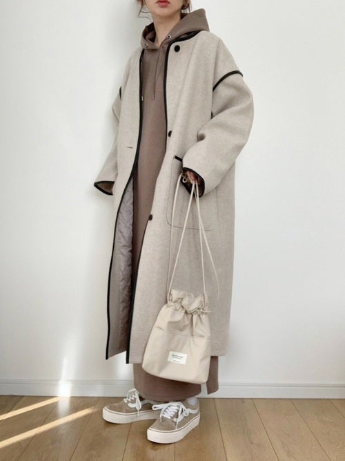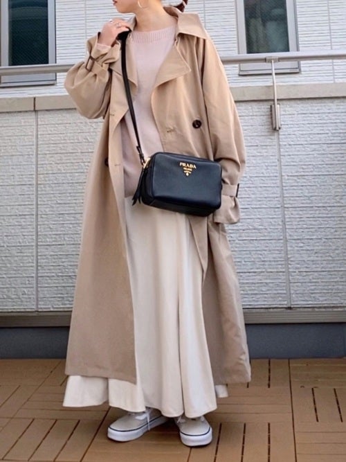 アウターもミルクティーみたいな優しいライトベージュのロングコートを選んで、おしゃれなお店でもさりげなく目立てそうなレディースファッションを完成させましょう。