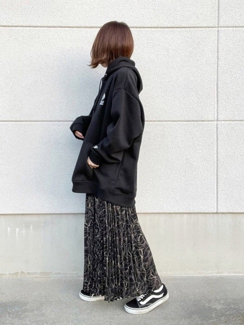 黒ロングパーカー&花柄ロングプリーツスカートのコーディネートは、VANSのシグネチャーモデルでもあるオールドスクールスニーカーでオーソドックスにまとめましょう。